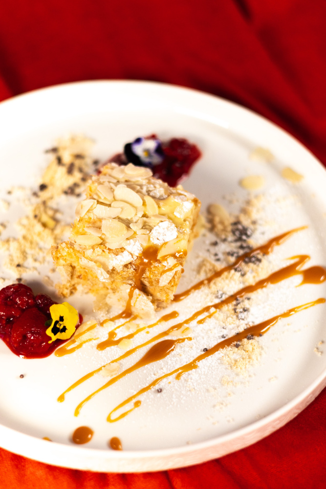 vrstvené listové těsto se smetanovým krémem, malinový coulis, mandle, karamel