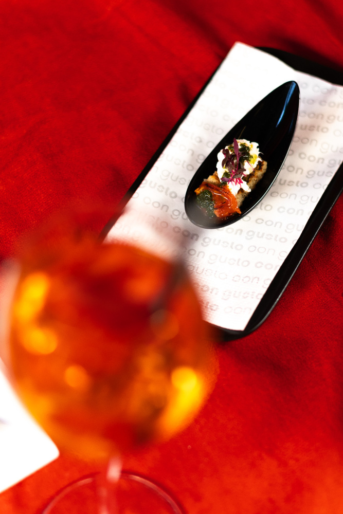 Večer zahájíte welcome drinkem Spiritz Temptation Spritz, jemným spritzem z odrůdy Chardonnay s extraktem ze španělských pomerančů, podávaným na ledu s lyofilizovanými jahodami.