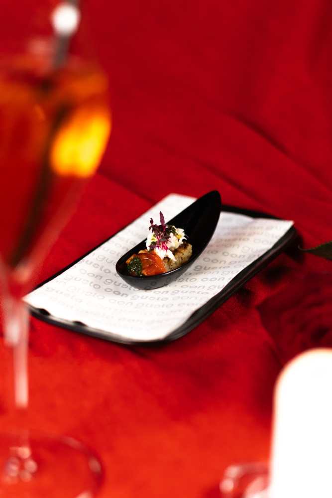 Jako amuse bouche vás určitě potěší máslová brioška se stracciatellou di burrata, konfitovaným rajčetem a janovským bazalkovým pestem.