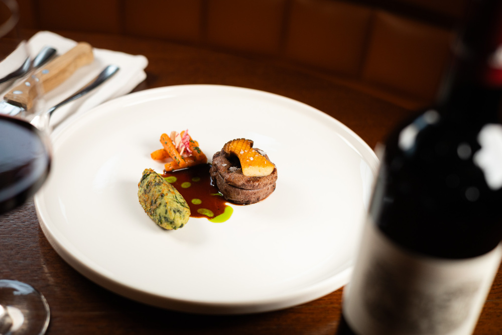 ricottové gnudi s medvědím česnekem, glazovaná karotka, hlíva královská na uhlí, jemná demi-glace