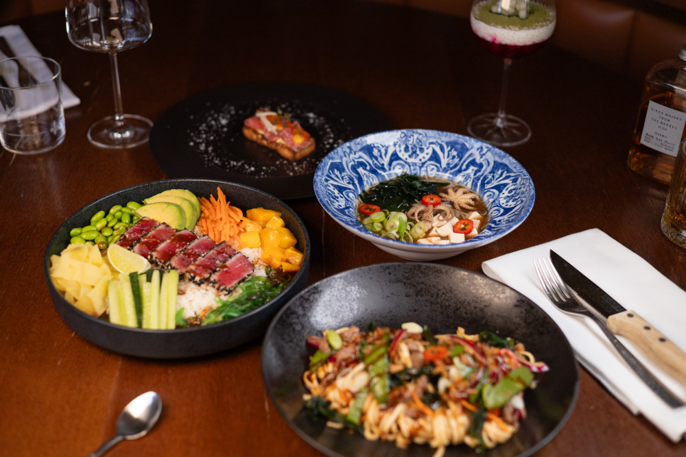 For the main course, the fish option features a sashimi tuna steak bowl with fresh tuna in black sesame, sushi rice, avocado, mango, edamame beans, nori seaweed, vegetables, ginger, and ponzu sauce with lime. Meat lovers will enjoy the beef striploin prepared as a beef udon stir-fry, served with udon noodles, goma wakame, tonkatsu sauce, garlic, chili, spring onion, sugar snap peas, and coriander.